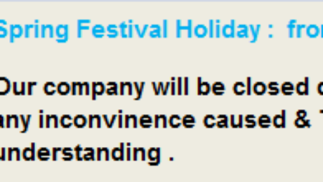 Dear Our Valued Customers: We are glad to inform you that our office will be closed from February-9 to February-17 to celebrate our traditional spring festival and we will come back to work in February-18-2021, we do apologizes for any inconvenience caused by our holiday. Thanks for your understanding and support, wish you all have